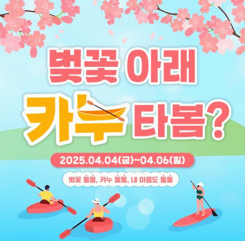 이번 ‘카누타봄’ 이벤트는 은파호수공원의 아름다운 벚꽃을 찾는 관광객들에게 이색적인 경험을 선사하기 위해 추진되는 체험으로 레저카누 20대(2인승 10대, 1인승 10대)로 1일 5회로 운영되며 일일 150명이 함께 즐길 수 있다.