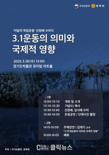이날 기념식과 선정패에 이어 ‘3・1만세운동의 의미와 국제적 영향’의 김재기 전남대학교 정치외교학과 교수의 주제 강연이 진행된다.