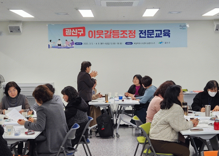 광산구 관계자는 “전문교육은 광산구 이웃갈등 조정활동가의 기술과 역량을 한층 높이는 장이 될 것”이라며 “교육생 모두가 어떤 상황에서도 능숙하게 갈등 해결을 돕고, 주민 간 신뢰 회복과 화해를 돕는 소통 전문가로 거듭나길 기대한다”고 말했다.
