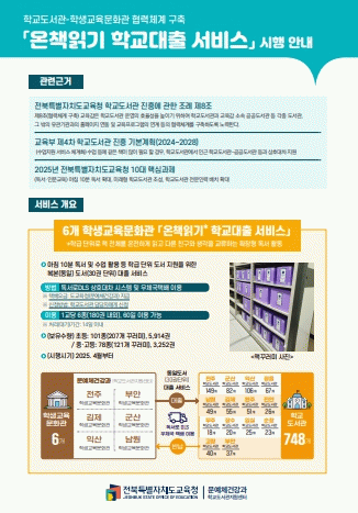 온책읽기 학교대출 서비스는 1교당 6종(180권 내외), 60일간 이용 가능하다. 6개 학생교육문화관에서는 이와 연계해 다양한 독서지도 프로그램도 운영한다.