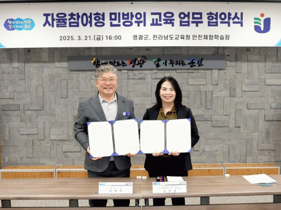 이번 협약은 법성면에 소재한 전라남도교육청안전체험학습장이 행정안전부 민방위 교육 인정 안전체험관으로 지정됨에 따른 상호 협력의 세부내용을 규정하기 위함이라고 한다.