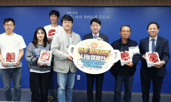 전주시딸기연구회 임원진 5명은 25일 전주시청을 방문해 1인 가구 등 위기가구 발굴 지원을 위한 ‘전주 함께라면’에 성금 300만원 을 기탁했다.