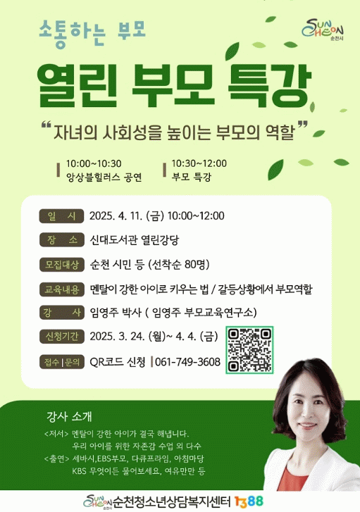 참가 신청은 부모, 지도자 등 순천시민이면 누구나 무료로 참여할 수 있으며, 네이버폼또는 QR코드 스캔을 통해 접수 가능하다.