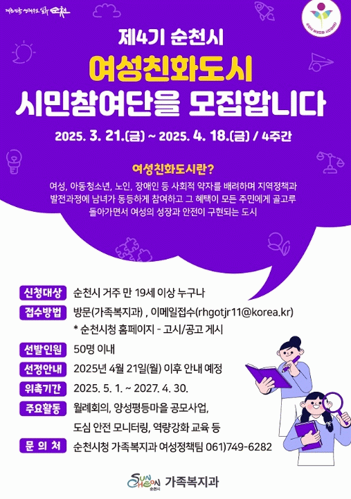 시 관계자는 “여성친화도시 순천을 위해 시민참여단 운영뿐만 아니라 다양한 사업을 추진하여 시민 참여를 확대하고, 양성평등 문화 확산을 위해 최선을 다하겠다”고 전했다.