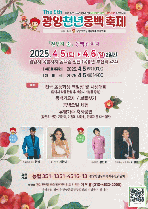 이우홍 추진위원장은 “이번 축제에서 많은 관광객들이 옥룡사지 동백숲의 아름다움을 만끽하고, 다채로운 공연과 체험행사를 통해 소중한 추억을 남기길 바란다”며, “모두에게 활력과 즐거움을 선사하는 광양천년동백축제가 되기를 희망한다”고 전했다.