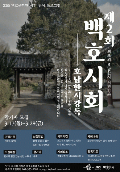 김대현 소장은 “호남한시를 읽는 시민강좌는 백호시회가 처음”이라며 “왜 호남을 문향이라고 하는지 직접 확인하는 자리가 될 것”이라고 말했다.