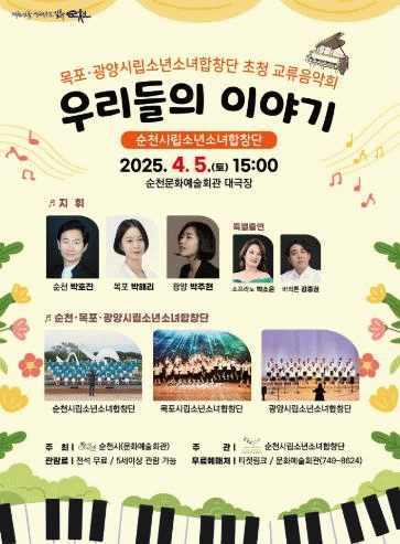 이번 연주회는 ‘우리들의 이야기’를 주제로 목포·광양시립소년소녀합창단을 초청한 교류 음악회로 동요와 가곡을 통해 아이들의 순수함과 아름다움을 선사할 예정이다.