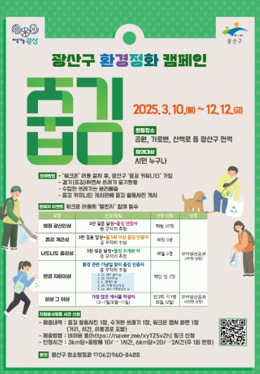 캠페인은 12월 12일까지 누구나 참여할 수 있으며, 참여 희망자는 광산구 걷기 앱인 ‘워크온’을 설치하고, 광산구 줍깅 커뮤니티에 가입한 후 게시판에 줍깅 활동 인증 사진을 올리면 된다.