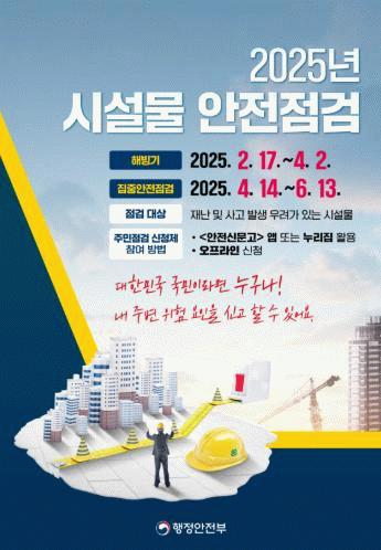 ‘집중안전점검 주민점검 신청제’는 주민들이 직접 시설 안전점검을 신청해 공무원과 민간 전문가가 합동점검을 실시하는 제도로 신청은 ‘안전신문고’ 앱‧포털을 통한 온라인 접수(4.30.까지) 또는 읍‧면‧동사무소 방문 접수(4.15.까지)로 가능하다.
