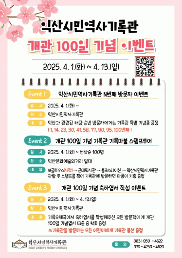 100일 행사를 비롯해 더욱 자세한 내용은 익산시민역사기록관으로 문의하면 된다.