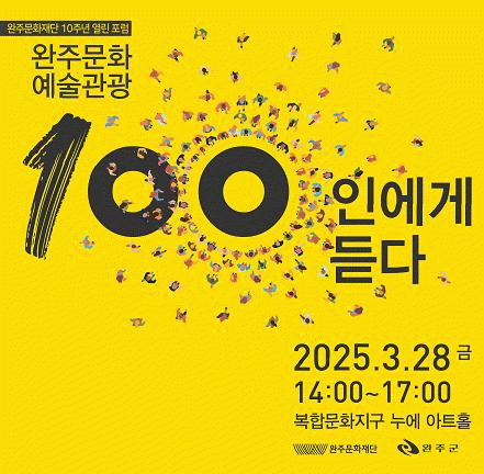 ‘완주문화예술관광 100인에게 듣다’는 완주문화재단의 성과를 공유하고, 완주문화예술 환경 변화에 따른 문화 · 예술 · 관광 진흥 방안을 모색하기 위한 자리로, 지역에서 활동 중인 예술인, 문화기획자, 관광 종사자, 기관 · 단체 관계자 등 100여 명이 참여한다.