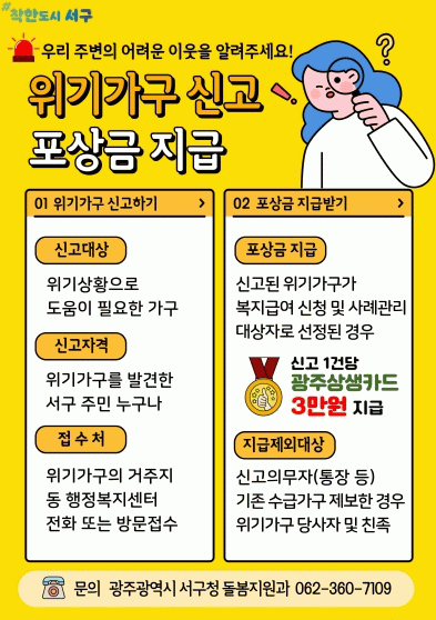 서구 주민 누구나 실직이나 폐업으로 소득이 없어 생계가 어려운 가구, 질병이나 장애로 돌봄이 필요한 가구를 발견할 시 관할 동 행정복지센터를 방문 또는 전화하거나 ‘복지위기 알림’ 앱을 통해 제보할 수 있다.