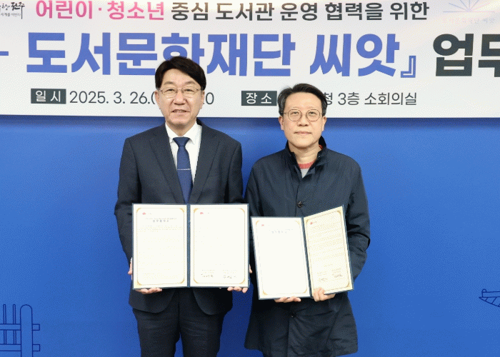 시와 ‘도서문화재단 씨앗’은 26일 전주시청 3층 회의실에서 우범기 전주시장과 김태윤 상임이사 등 양 기관 관계자들이 참석한 가운데 전주시립도서관 꽃심 내 트윈세대 전용공간인 ‘우주로1216’과 전주혁신도시 복합문화센터 어린이 작업실 ‘모야’ 운영 협력을 위한 업무협약을 체결했다.