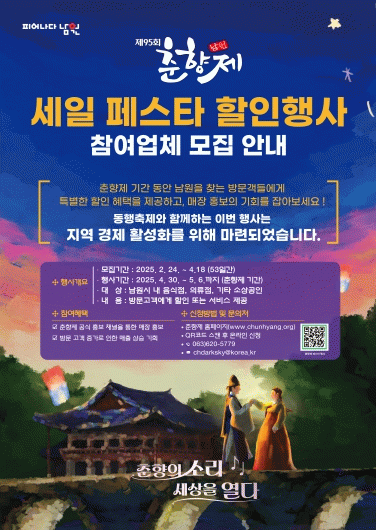 특히, 이번 ‘동행 페스타’는 참여 업소들이 춘향제의 성공적인 운영에 직접 기여하는 기회가 될 것으로 기대된다. 참여하는 업체들은 지역경제 활성화와 더불어, 남원을 찾은 관광객들에게 좋은 인상을 남길 수 있는 기회가 될 것으로 보인다.