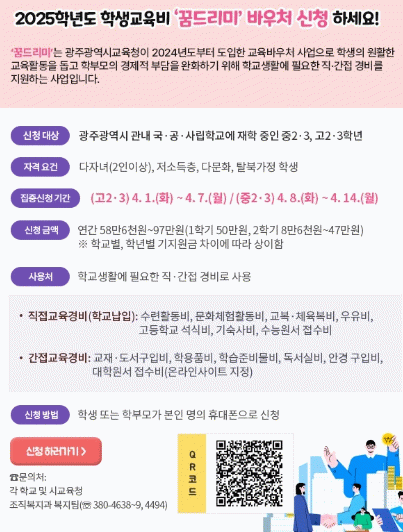 지원 금액은 학생 1인당 연 100만 원이며, 졸업앨범비, 현장체험학습비, 수학여행비 등 학교·학년별 기지원금에 따라 차등 적용해 최대 97만 원까지 지급한다. 포인트는 광주지역 업체에서 교재·도서구입, 독서실 이용, 학용품·안경 구입 비용으로 활용할 수 있다. 고3 학생의 경우 대학 원서접수비로도 사용할 수 있다.