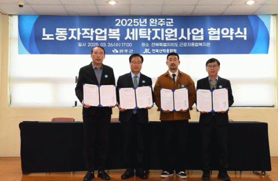 지난 26일, 완주군은 전북자치도 근로자종합복지관에서 (사)전북산학융합원, 대표 참여기업, 전문세탁업체와 업무협약을 체결했다.