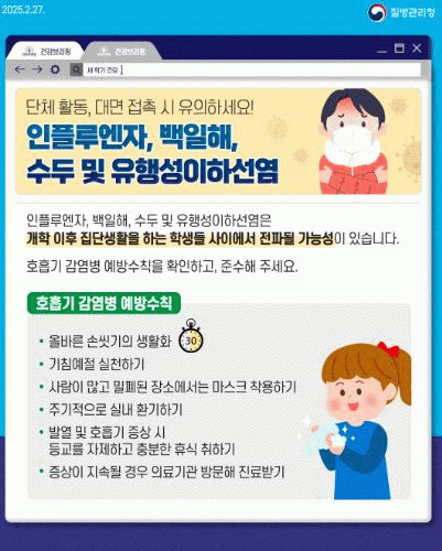 호흡기 감염병은 연례적으로 학기 중 발생이 증가했다가 방학 기간 감소하는 특성을 보이므로 신학기 실내 공동생활을 하는 학령기 소아와 청소년 감염 예방에 주의가 필요하다.