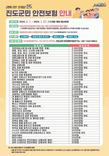 김희수 진도군수는 “군민들이 일상생활에서 안심하고 생활할 수 있도록 군민안전보험 보장 범위를 점진적으로 확대하는 등 군민 복지 향상을 위해 최선을 다하겠다”라고 밝혔다.