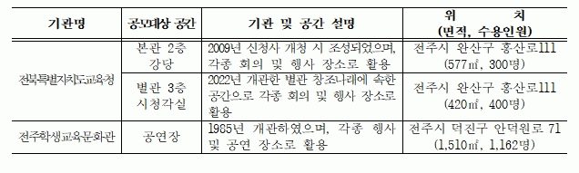 서거석 교육감은 “교육시설 명칭 공모는 교육가족은 물론 많은 도민들의 창의적인 의견을 듣고, 누구나 공감할 수 있는 명칭을 선정하고자 기획됐다”며 “시설의 상징성과 교육적 가치를 더욱 높이고, 교육 가족과 도민이 친숙하게 이용할 수 있는 아이디어를 가진 분들은 적극 응모해 주길 바란다”고 말했다.
