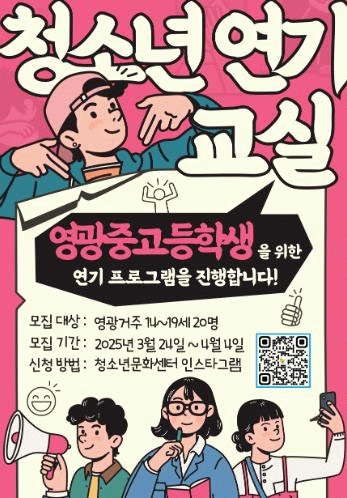 참여 대상은 영광군에 거주하는 만 14세에서 19세 이하의 청소년 20명이며, 3월 24일부터 4월 4일까지 영광군 누리집 고시 또는 영광군청소년문화센터 인스타그램을 통해 신청할 수 있다.