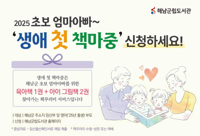 생애 첫 책마중 서비스는 해남군에 주소를 둔 임신부 및 영아(2025년 출생) 부모에게 육아 관련 정보를 제공하고, 아이에게 첫 책을 선물하는 기회를 마련하고자 육아책과 아이그림책으로 구성된 책 꾸러미를 선물하는 사업으로 오는 4월부터 신청가능하다.
