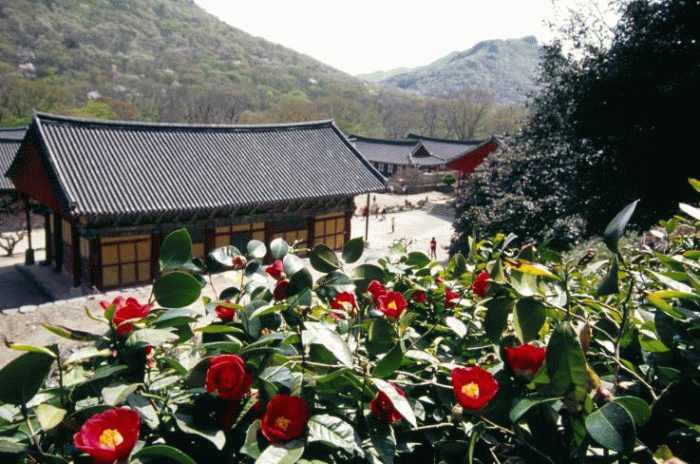 상록활엽수인 동백나무는 잎이 두껍고 수분함유율이 높아 사찰내 산불의 진행을 최대한 더디게 하는 효과가 있다.