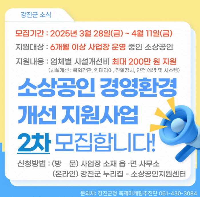 지원 항목은 옥외 간판, 내부 인테리어, 진열 장치, 안전 및 방범 시스템 등으로 구성돼 있으며 지원 대상은 사업 공고일 기준 6개월 이상 강진군 내에서 사업장을 운영 중인 소상공인이다.