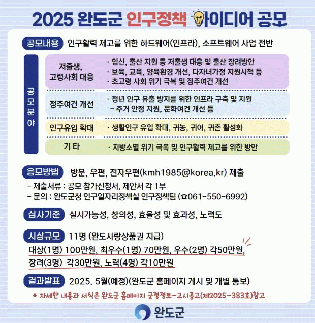 완도군 발전에 관심 있는 국민 누구나 참여할 수 있으며 응모는 완도군청 인구일자리정책실 인구정책팀으로 방문, 우편, 전자우편으로 참가신청서와 제안서를 제출하면 된다.