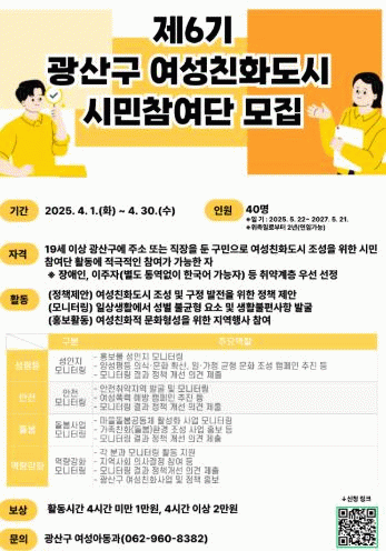 여성친화도시 시민참여단의 임기는 5월 22일부터 2027년 5월 21일까지 2년이며, 여성친화·양성평등 정책에 관심 있는 19세 이상 광산구 주민 누구나 지원할 수 있다.