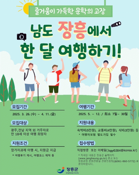 공고일 기준 광주·전남 외 주소지를 둔 관광객 중 장흥 여행을 희망하는 누구나 신청 가능하다.
