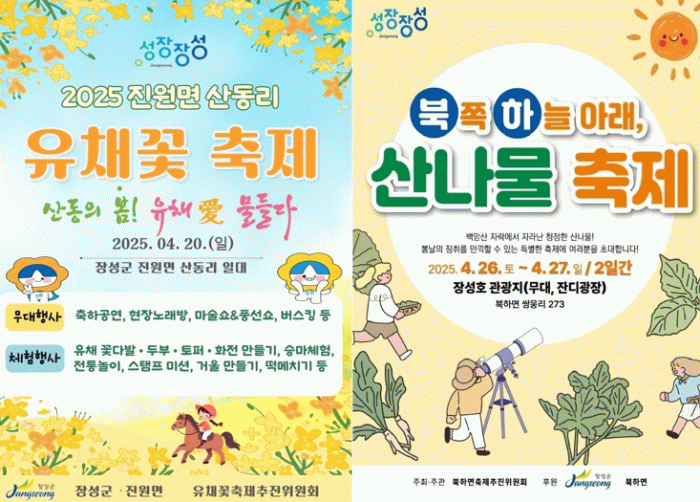 4월 26일~27일에는 북하면이 올해 처음 선보이는 ‘산나물축제’가 기다린다. 산나물 산지로 유명했던 지역의 역사성을 접목해 축제로 기획했다. 장성호관광지에서 열리며 태양 관측, 산나물 채취, ‘산채비빔밥 퍼포먼스’ 등 독특한 체험을 즐길 수 있다.