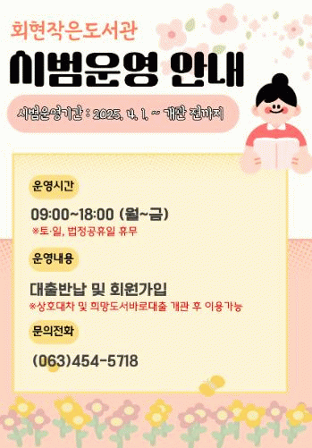 자세한 사항은 군산시립도서관 누리집을 참고하거나 회현작은도서관으로 문의하면 된다.