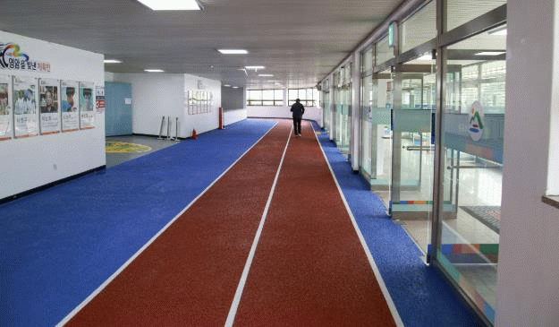 영암군은 최근 늘고 있는 달리기 동호인들이 날씨에 상관없이 실내에서 편안하게 운동할 수 있도록 실내체육관 복도를 새단장했다.