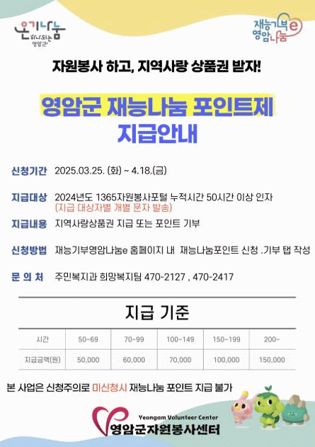 포인트 신청은 ‘재능기부 영암나눔e’ 홈페이지에서 할 수 있고, 인정 봉사 시간에 따라 영암군은 5~15만원의 지역사랑상품권을 제공할 예정이다.