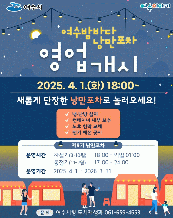 여수시에 따르면 제9기 낭만포차 운영협의회는 약 한 달간 냉난방기 설치, 컨테이너 내부 보수, 노후 천막 교체 공사를 진행했으며, 영업 개시 전 포차 광장에서 번영과 무사고를 다짐하는 기원제를 가질 예정이다.