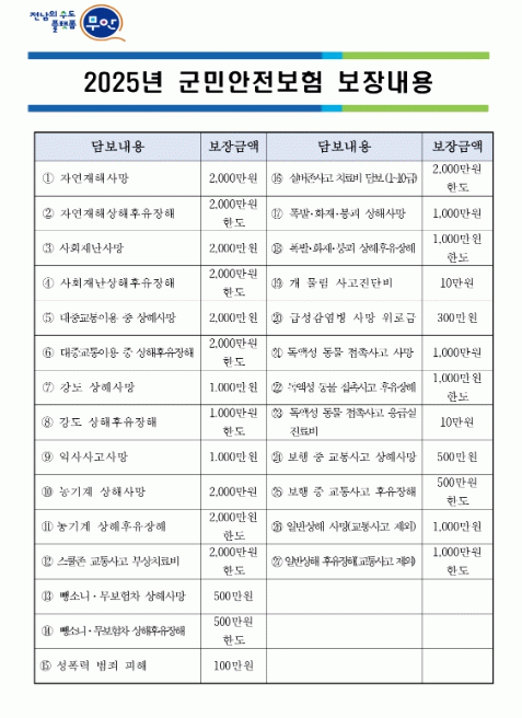 특히, 올해부터는 ▲24시간 일반상해 사망·후유장해 ▲급성감염병 사망위로금 ▲독액성 동물 접촉사고 사망·후유장해 등 보장항목 개편을 통한 더욱 폭넓은 보상으로 군민의 생활 안정을 도울 계획이다.