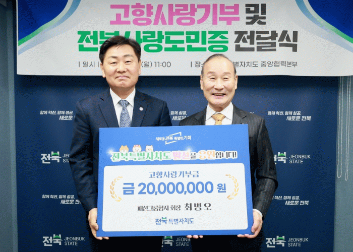 전북자치도는 이에 대한 감사의 뜻을 담아 ‘전북사랑도민증’을 최 회장에게 전달했다. 전북사랑도민증은 전북에 주소지를 두지 않아도 전북을 사랑하고 응원하는 사람이라면 누구나 발급받을 수 있는 증서로, 전북 14개 시군의 주요 관광·문화시설과 음식점, 카페 등을 최대 50%까지 할인된 가격에 이용할 수 있다. 또한 전북 투어패스 1일권이 기본 제공된다.