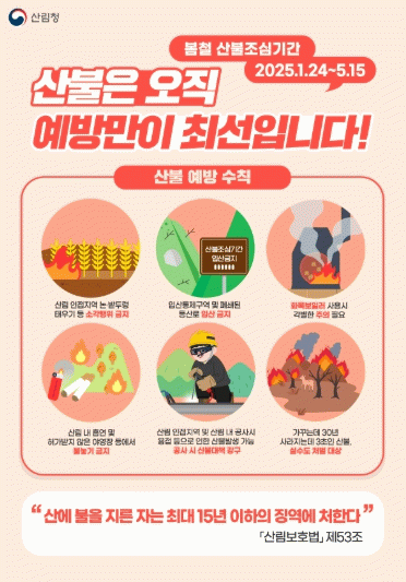 주요 내용은 △산림 인접 지역 논 밭두렁 태우기 등 소각행위 금지 △입산통제구역 및 폐쇄된 등산로 입산 금지 △화목보일러 사용시 각별한 주의 △산림 내 흡연 및 허가받지 않은 야영장 등에서 불놓기 금지 △산림 인접 지역 및 산림 내 공사시 용접 등으로 인한 산불방생가능 공사시 산불 대책 강구 등이다.