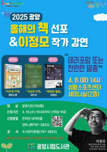 광양시립도서관은 지난 3월 ‘2025 올해의 책’ ▲어린이 부문에'아무네 가게'(정유소영, 고래가숨쉬는도서관), ▲청소년 부문에 '고요한 우연'(김수빈, 문학동네), ▲성인 부문에'찬란한 멸종'(이정모, 다산북스) 총 3권을 선정했으며, 이번 선포식 행사로 ‘2025년 시민 한 책 읽기 사업’의 포문을 연다.
