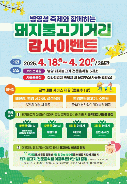 축제장에서 당일 5만 원 이상 결제한 영수증을 이벤트 시간에 제시하면 돼지불고기 전문음식점에서 사용 가능한 1만 원 상당의 쿠폰을 받을 수 있다.