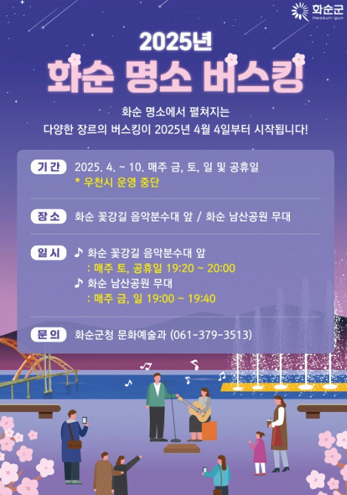 강삼영 문화예술과장은 “화순 명소에서 진행될 버스킹 공연에 많은 분이 참여해 더욱 풍성한 문화생활을 마음껏 누리시길 당부드린다”라고 말했다.2025년 화순 명소 버스킹 홍보물