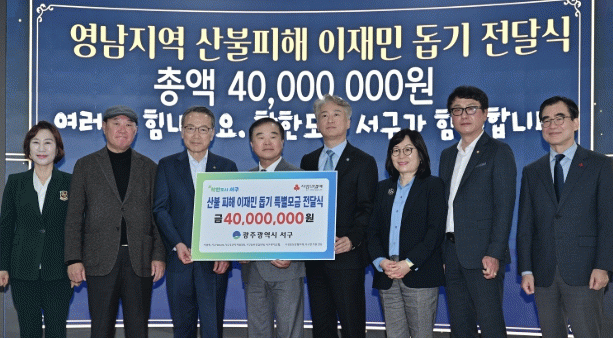 김이강 서구청장은 “짧은 기간에 많은 분들이 산불 피해 지역민을 돕기 위해 뜻을 모아 주셔서 대단히 감사하다”며 “이것이 바로 착한도시 서구민들의 나눔과 연대의 정신이고 자산이라고 생각하며 피해지역 주민들이 하루빨리 따스한 봄기운처럼 생기를 되찾아 평화롭고 안전한 일상으로 돌아갈 수 있기를 바란다”고 말했다.