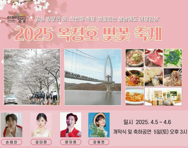 군은 오는 5일부터 6일 이틀간 옥정호 출렁다리 앞 특설행사장에서 임실 방문의 해와 만나는 특별한 축제인 2025 옥정호 벚꽃축제를 개최한다.
