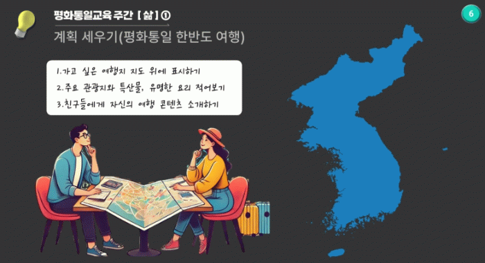 학생들은 주제에 대해 배운 후, 활동자료를 통해 ‘광복군 암호표 해독하기’, ‘한반도 여행 계획 세우기’, ‘우리 반 헌법 제정하기’, ‘안용복의 삶에 대한 역할극’, ‘역사 신문 만들기’ 등을 하게 된다.
