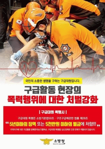 현행 ‘소방기본법 제50조’, ‘119구조·구급에 관한 법류 28조’에 의하면 소방대원에게 폭행 또는 협박을 행사해 구조·구급활동을 방해한 자는 5년 이하 징역 또는 5000만원 이하 벌금에 처하도록 규정하고 있다.
