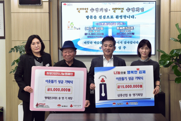 이날 ▲ (유)삼흥산업과 형제콘크리트가 이웃돕기 성금 2,000만원, ▲형제콘크리트가 김제사랑장학금 500만원, ▲(유)삼흥에코그린이 고향사랑기부금 500만을 기부했다. 기탁된 성금은 관내 저소득 취약계층 지원과 지역 인재 양성을 위한 장학금, 그리고 고향 발전을 위한 기금으로 각각 활용될 예정이다.