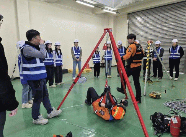 이번 교육에서는 질식사고 발생 사례, 밀폐공간 작업 시 안전조치 사항, 가스 농도 측정 및 환기 방법, 공기호흡기 착용법과 인명구조 삼각대 등 장비 조작법을 포함한 다양한 안전교육을 실시했다.