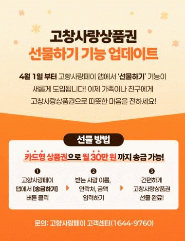 아울러, 고창군은 지역경제 활성화를 위해 시행되고 있는 고창사랑상품권을 4월 1일부터 10% 상시 할인 판매한다.