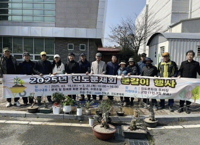올해 행사는 회원 26명으로 구성된 진도분재회에서 자부담으로 분재 115점과 화분 70점에 대한 분갈이, 수형조절, 철사 걸이 등을 진행하며, 방치된 분재를 새롭게 단장해 군민들로부터 많은 호응을 얻었다.