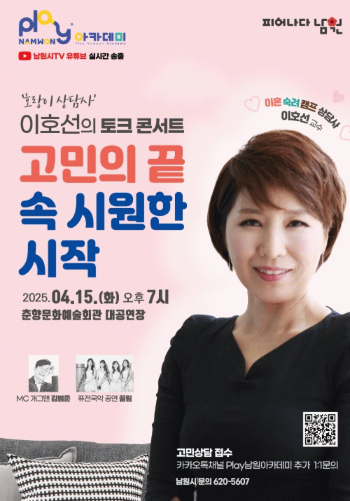 이번 Play남원 아카데미에서는 가족을 비롯한 관계 속 소통의 방법에 대한 강연과 더불어 가족, 인간관계, 직장 문제 등 남원 시민들의 실제고민을 나누고 이호선 교수의 현실적인 조언과 속 시원한 해결책을 모색하는 소통의 장이 될 예정이다.